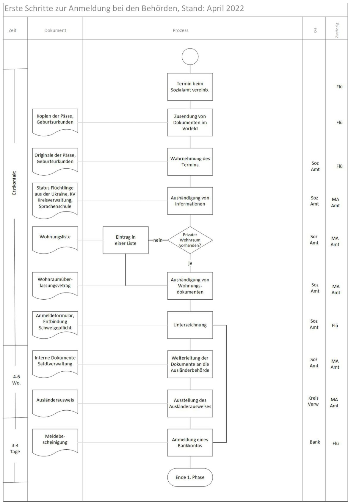 Den Ablauf aus behördlicher Sicht und somit das Rezept für erfolgreiche erste Integrationsprozesse habe ich als Schaubild an diesen abschließenden Text geheftet. In groben Schritten kann er aber skizziert werden. Zunächst ist es wichtig, dass Flüchtlinge registriert werden. An dieser Stelle soll auch klargestellt werden, ob Wohnraum angeboten wird, oder ob die Personen auf eine Warteliste gesetzt werden. Sicherlich müssen die Gäste im zweiten Fall in einer Sammelunterkunft untergebracht werden, bis eine Wohnung frei wird. Für das Angebot von privat organisiertem Wohnraum muss eine Wohnreimgeberbescheinigung ausgefüllt werden. Beides passiert auf dem Sozialamt. Hier erhält man auch die Adressen, um eine medizinische Versorgung einleiten zu können. In einem solchen Fall wird die Kreisverwaltung vom Patienten angerufen, der dann Kontakt mit dem benannten Arzt aufnimmt und im besten Fall die Übernahme der Behandlungskosten zusagt. Wenn sich ab Juni alle Flüchtlinge im Status ALG 2 befinden, werden auch Krankenkassen-Karten ausgestellt und der klassische Versicherungsschutz besteht. Auf dem Sozialamt erhält man auch Kontaktdaten für die VHS-Sprachenschule sowie Tickets für den regionalen Nahverkehr.